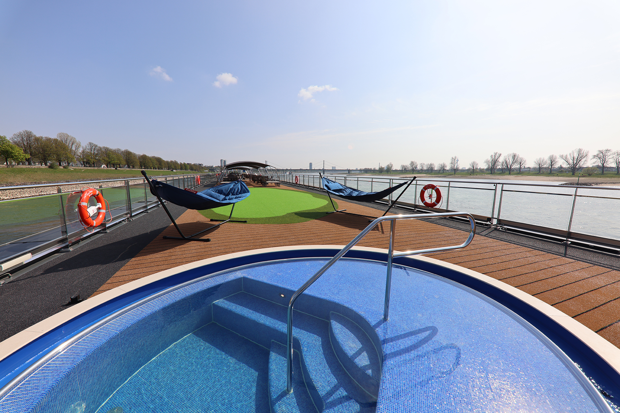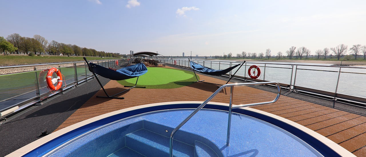 På soldækket kan du spille golf på putting green eller slappe af i den dejlig varme boblepool. Udforsk omgivelserne på en af skibets udlejningscykler.