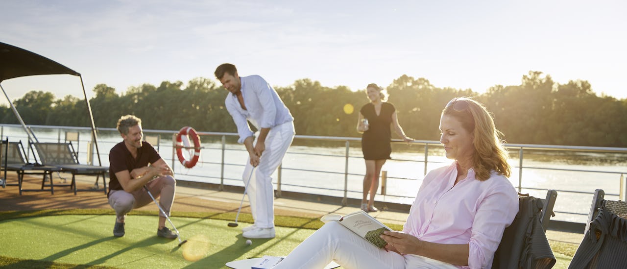Nyd det smukke forbipasserende landskab mens du spiller golf på soldækket, eller slapper af i boblepoolen. Når du er i land, kan du udforske omgivelserne på en af skibets udlejningscykler.