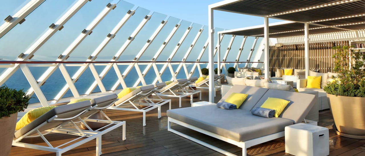 På pooldækket, som inkluderer et solariebassin under glastaget, er der også en udendørs pool og tagterrasse – specielt designet afslapningsområde med træskulpturer og grønne planter, der skaber en helt unik atmosfære.