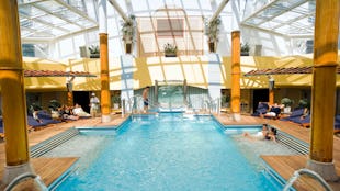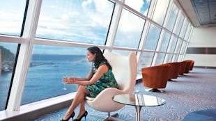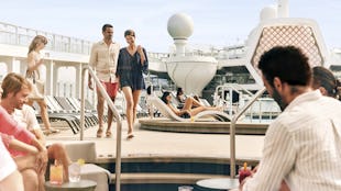Enjoy the Sunset Lounge, a chic open-air spot with a glass-sided plunge pool, seating, its own bar, and access via stairs to the aft Sundeck’s Sunset Park.