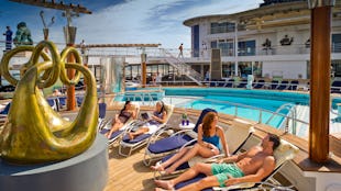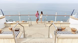Sunset Park on the top deck offers a stylish, relaxing retreat with a large sunbathing area, padded loungers, shaded seating with tables, and plenty of greenery.