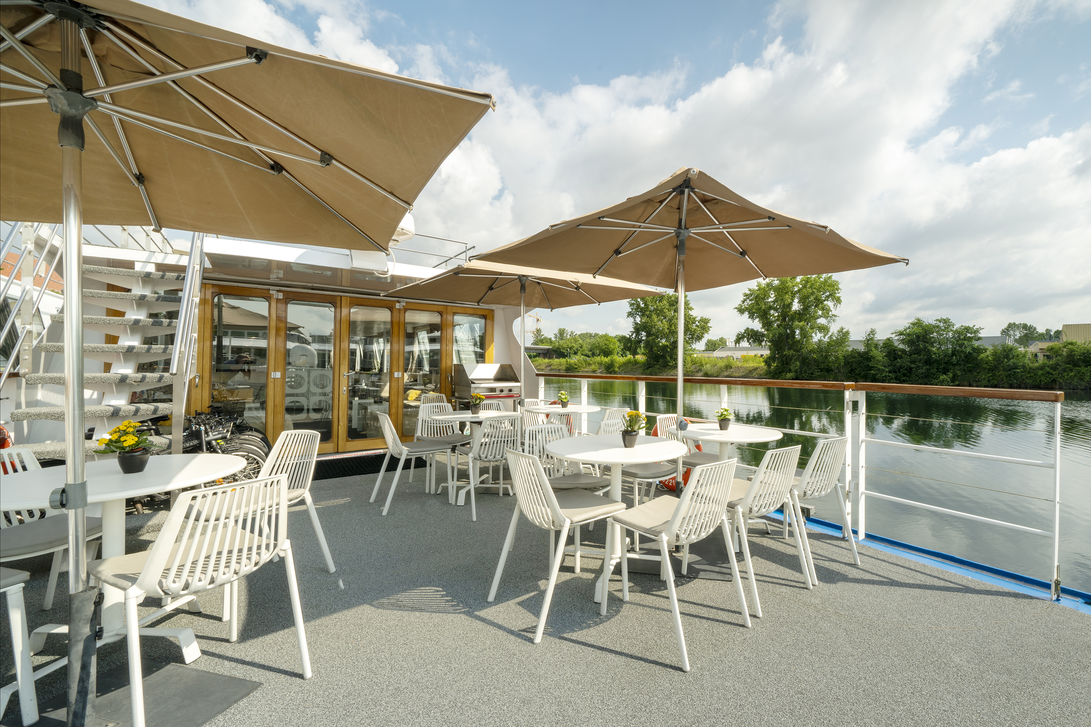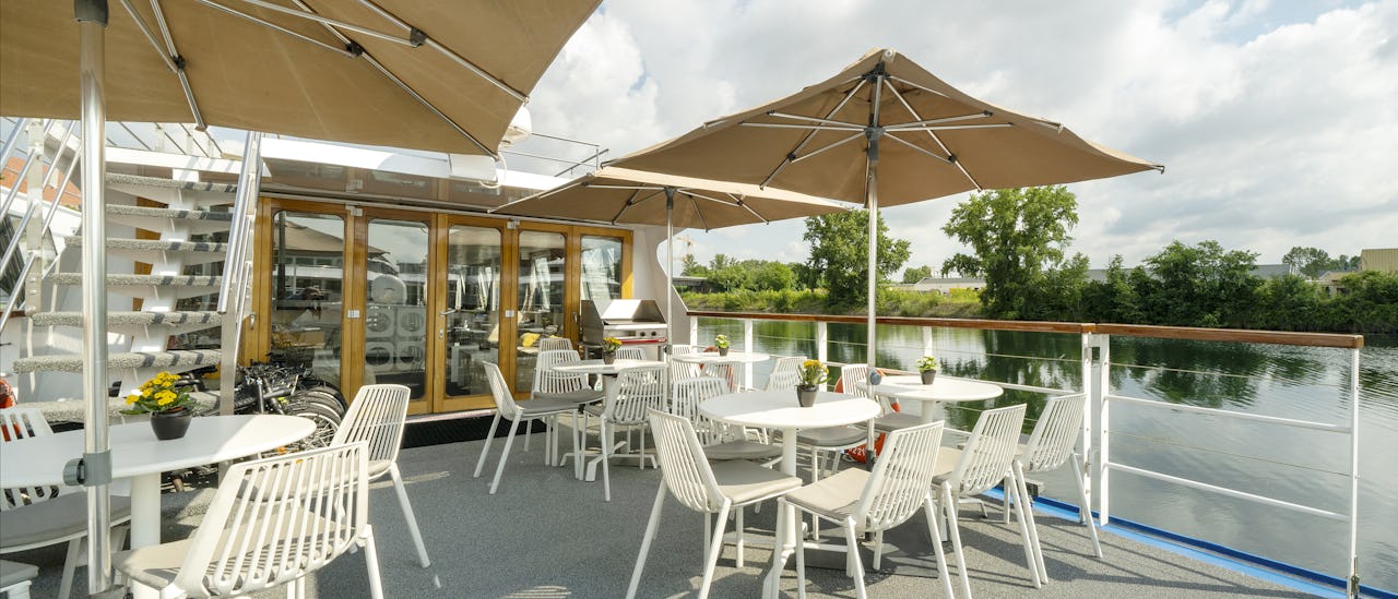 Placeret forrest på skibet og udstyret med borde og parasoller. Her kan du tilbringe tid med vennerne, mens du nyder udsigten.
