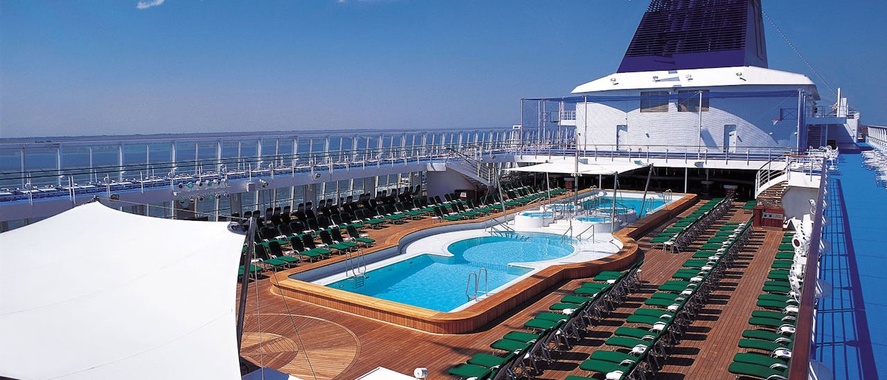 Højst oppe ligger pooldækket med flere pools og skønne solstole. Heroppe kan du også besøge spa-afdelingen eller træne i fitnesslokalet med en fantastisk havudsigt.